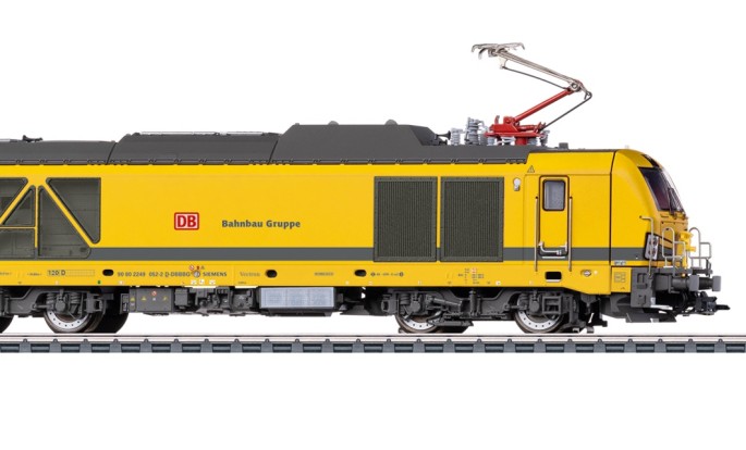 Das Modell des Dual-Mode Vectron Siemens stellt die neueste Anschaffung in Sachen Lokomotiven der DB Bahnbau Gruppe nach.